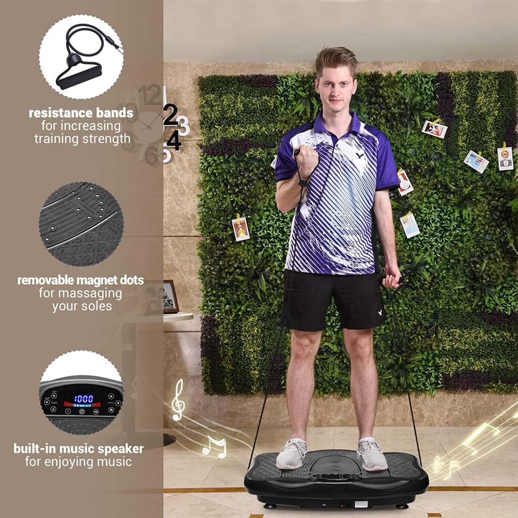 In case you want to turn up your exercise routine and burn more calories or fat in specific locations, the resistance band ensures you sweat more and enjoy your workout better, it also acts as a support to give more stamina while standing or squatting on the BodyVibra plate.